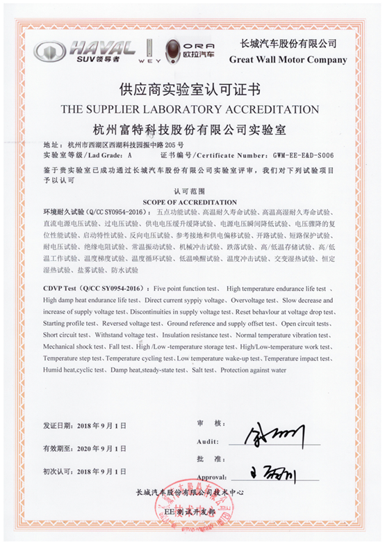 年9月,富特科技實驗室迎來好消息,正式成為了長城汽車授權認可的第二方實驗室,獲得其環(huán)境耐久試驗的授權。