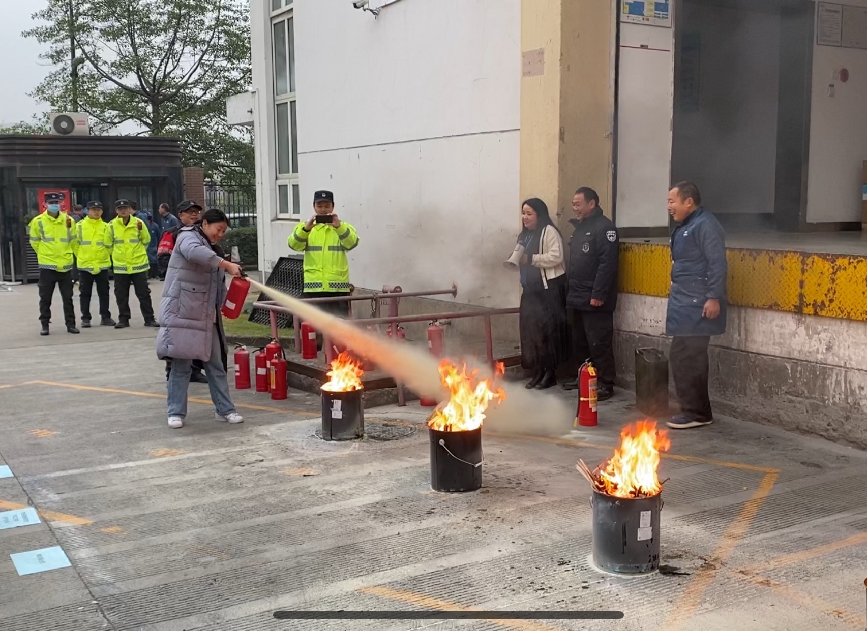 員工們?cè)谕瓿蓪W(xué)習(xí)、掌握滅火器的使用技能后,紛紛上前進(jìn)行演示。