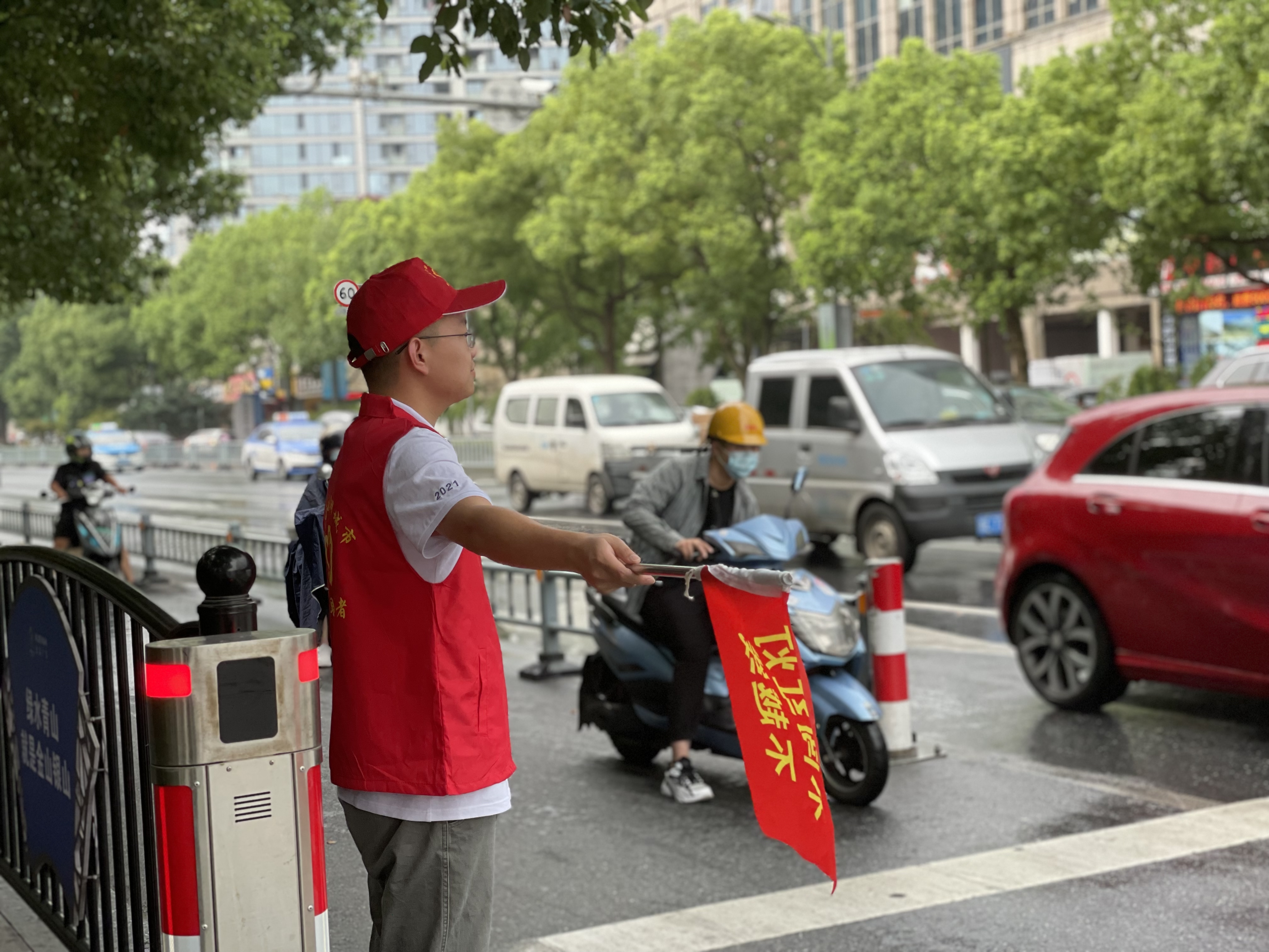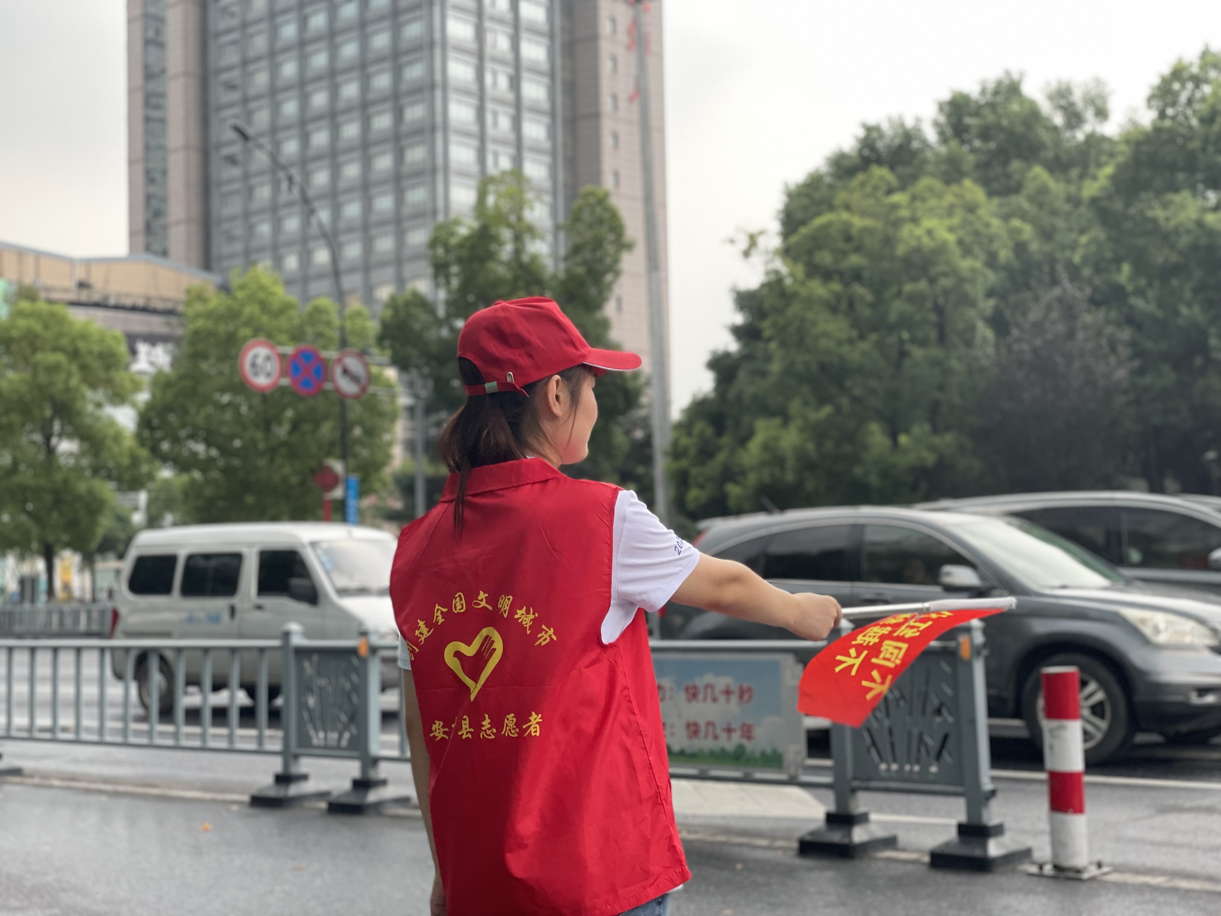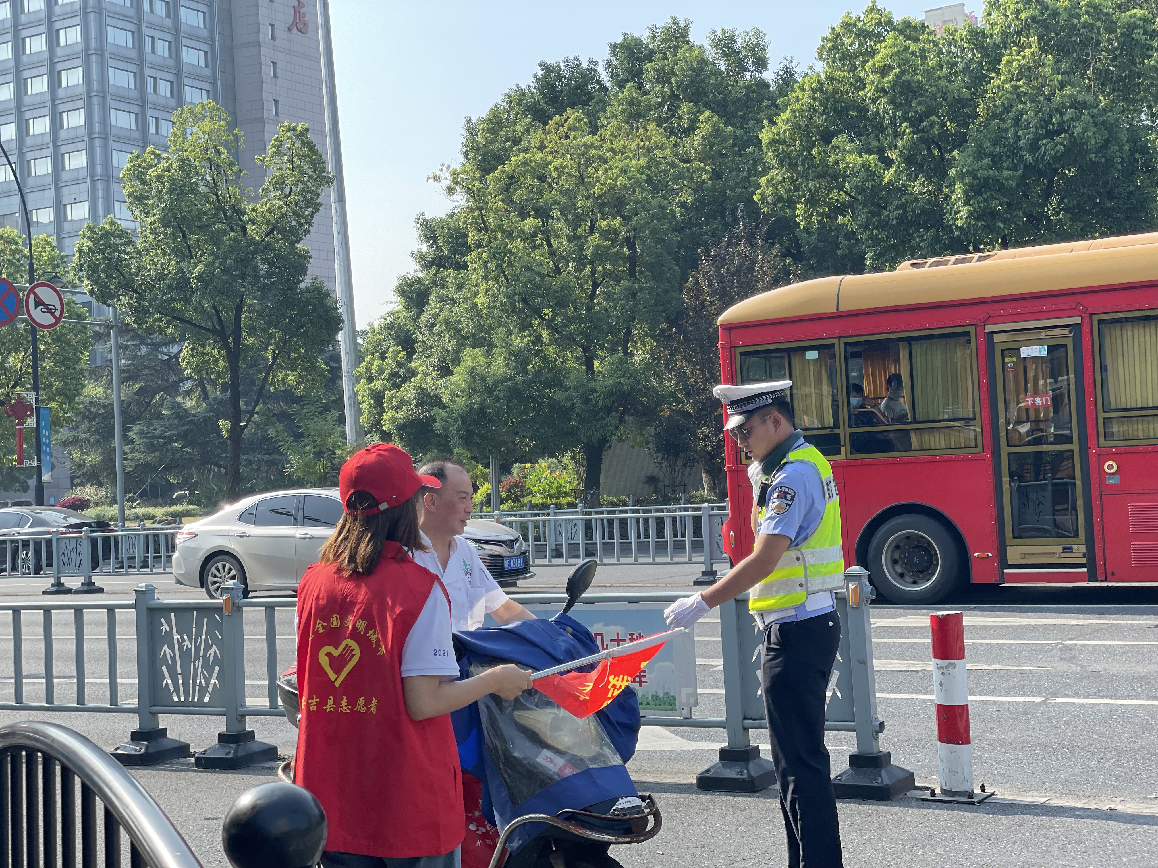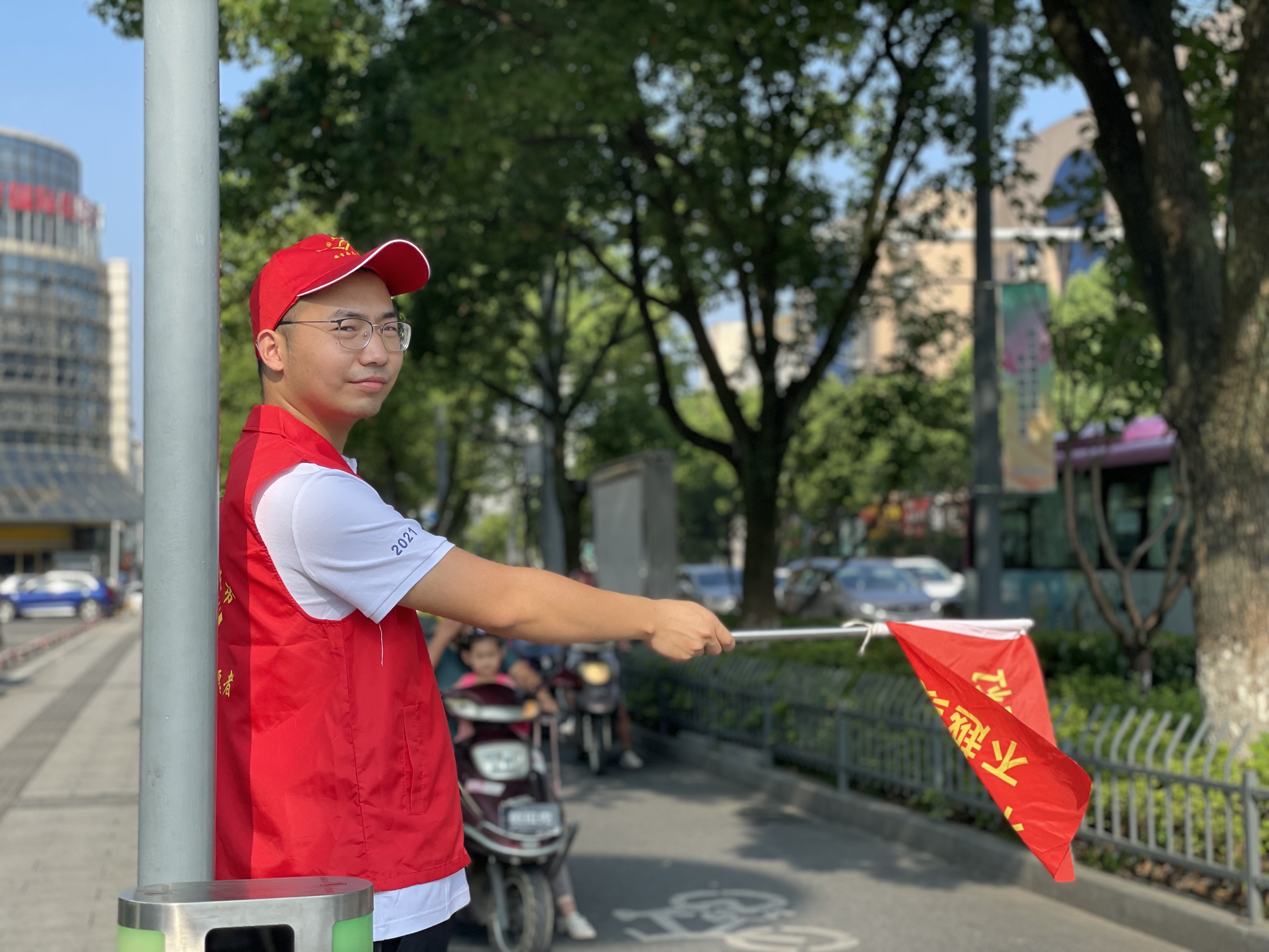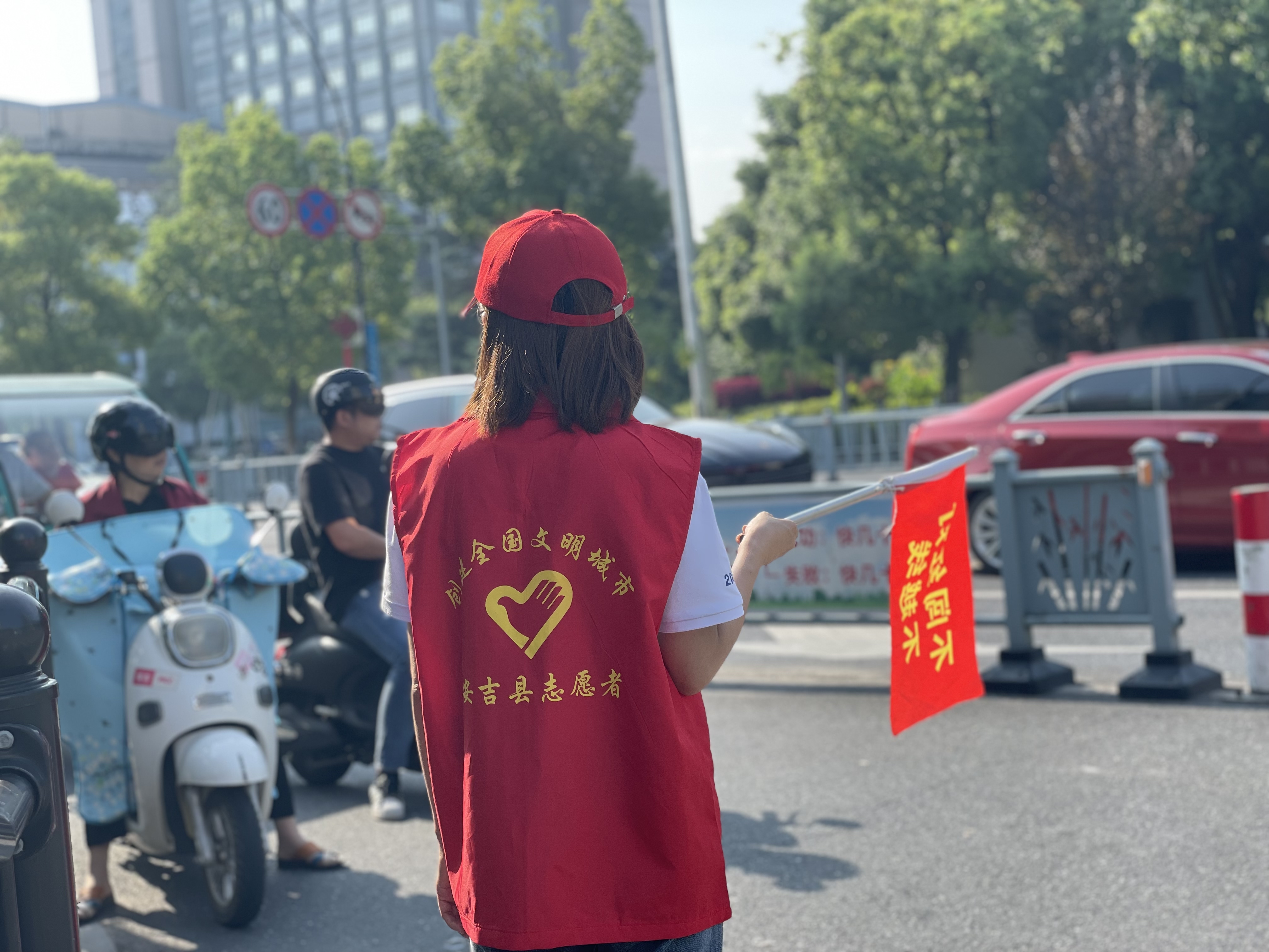 上午的安吉,天氣炎熱、陽光刺眼,志愿者們卻站的筆直、面帶微笑。他們說紅色的志愿馬甲穿在身上的時候,就代表著身上肩負著保衛城市的使命感與作為富特人的社會責任感。